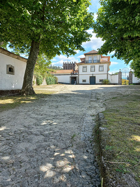 O pátio interior de acesso à cozinha, torre ameada, a capela, os jardins e a adega.